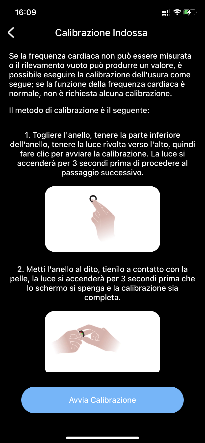 - Metti il ring sul dito e assicurati che sia ben aderente alla pelle fino a quando la luce si spegne. La calibrazione è completata.